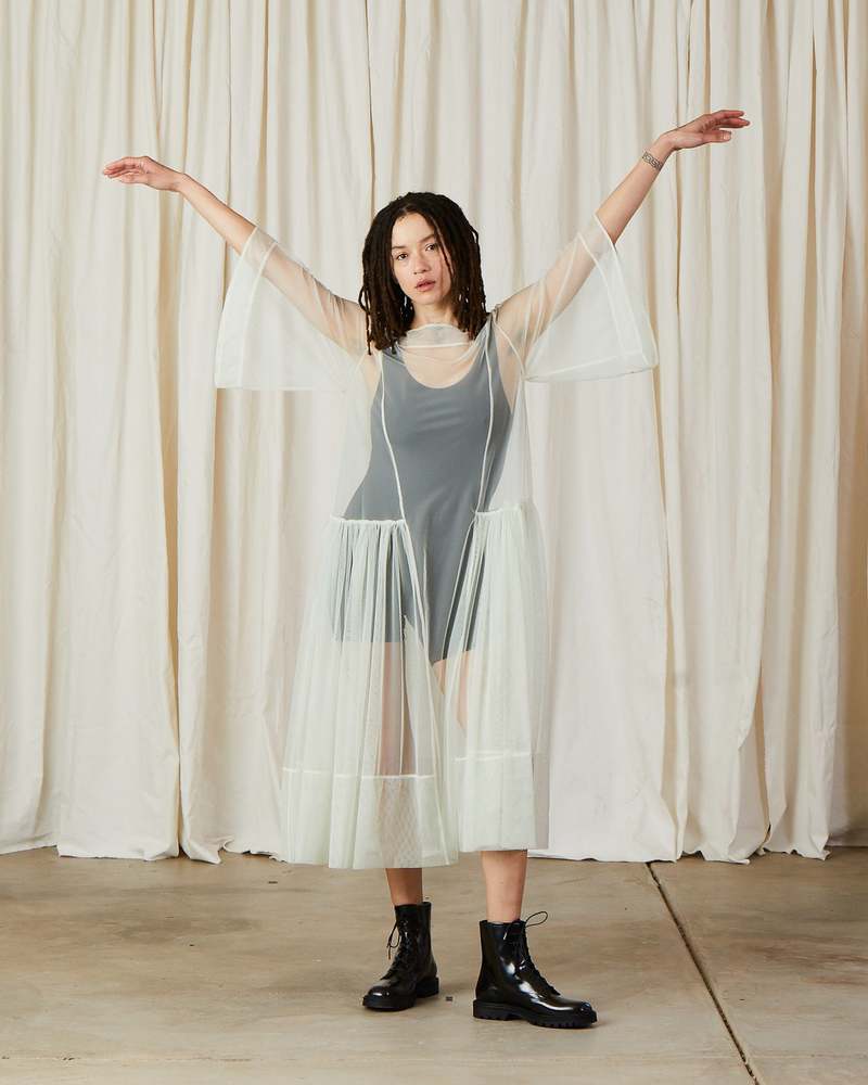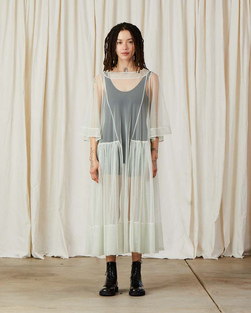 Step into sophistication with the ALI GOLDENSIDE RUFFLE MESH DRESS – LIGHT SAGE.
