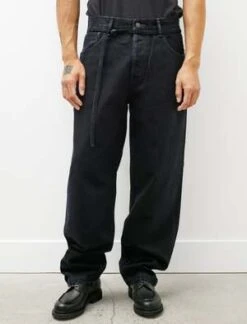 A relaxed, 90s inspired mid rise jean cut from a washed 11oz indigo denim that has been over dyed to black to create rich fading at the seams and hems. Features classic five pocket denim styling with a right side ticket pocket, a leather logo patch at the waist, and a narrow d-ring self belt. Cut with a roomy seat and a subtle taper through the inseam, the leg falls away from the body from the hips to the ankle creating a relaxed, classic silhouette. Constructed with flat felled seams through the seat to improve durability at a region of frequent abrasion.