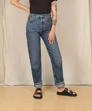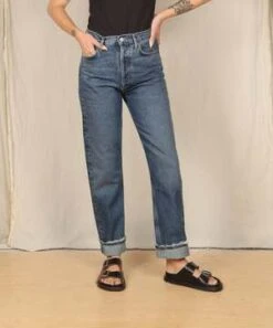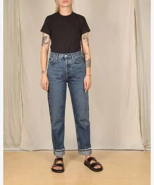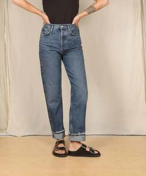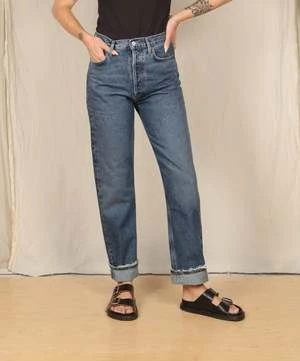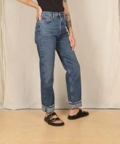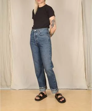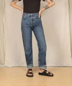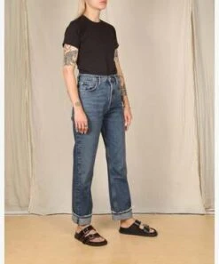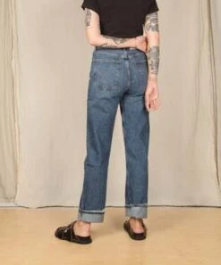 High rise jean with a relaxed straight leg and button fly in stonewashed darker blue non-stretch denim. Slightly slimmer through the hips and relaxed in the waist