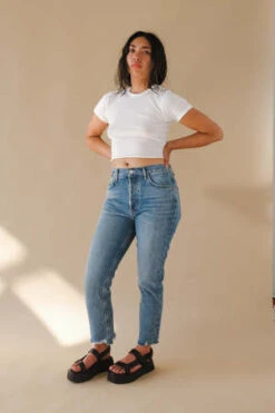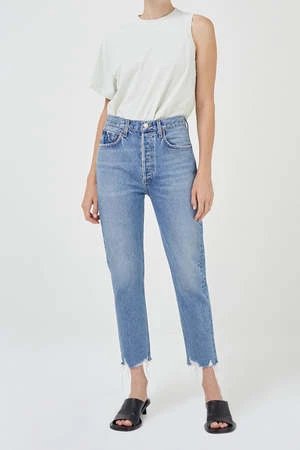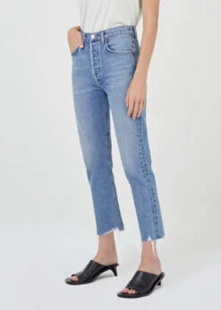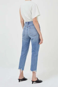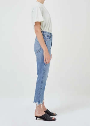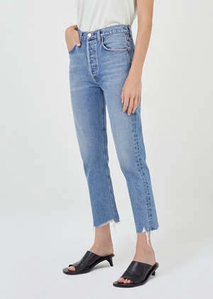 Agolde Riley high rise crop in medium indigo Haven wash. With a better-than-vintage aesthetic, the Riley is an iconic brand favorite. The flattering high-rise and straight leg hold close to the body for a universally loved look. Button fly and raw hem.