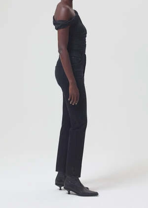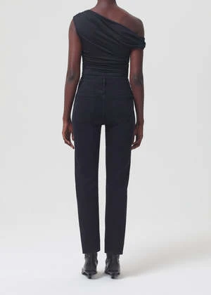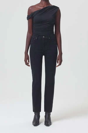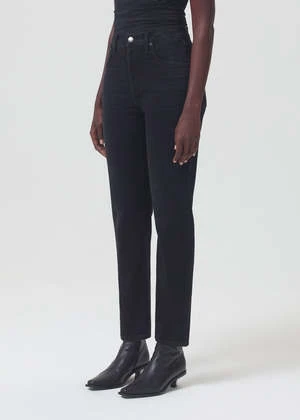 Agolde signature slim straight leg Riley long in washed black compilation. The flattering high-rise and straight leg fits close to the body for a universally loved look. Dark clean washed black with a finished hem, organic comfort stretch denim with a soft hand and vintage look. Button fly