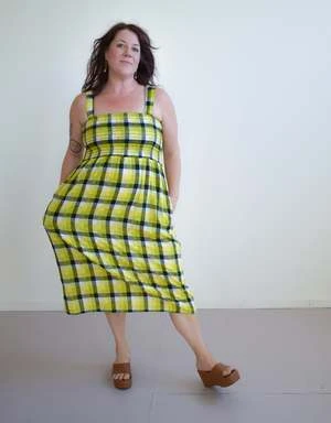 Smocking through the bust creates gorgeous, comfortable contouring that, for many busts, alleviates the need for bras (not for everyone, obviously) but the stretch and recovery is very lovely. Big roomy pockets at the side, a midi a-line skirt. The straps are wide enough to hide bra straps as well! Looks so cute by itself or paired with a shirt underneath if you want to layer it for colder weather!