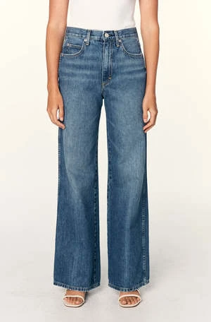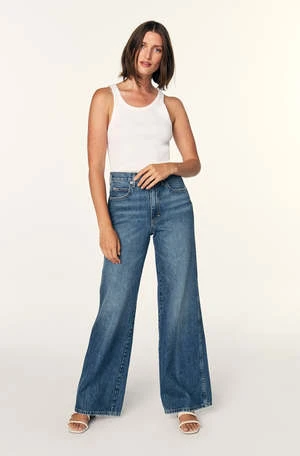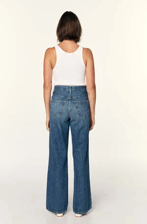 The Frida Wide Leg in Admire by AMO Denim is a high-rise wide leg with a zip fly, distressed details, and a full inseam with an easy, relaxed fit.