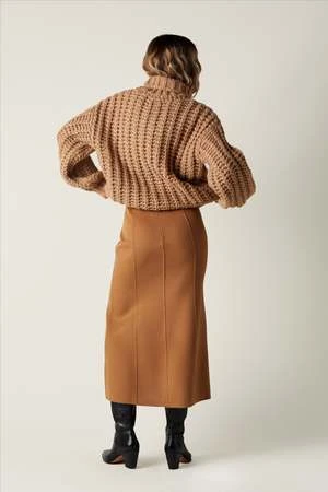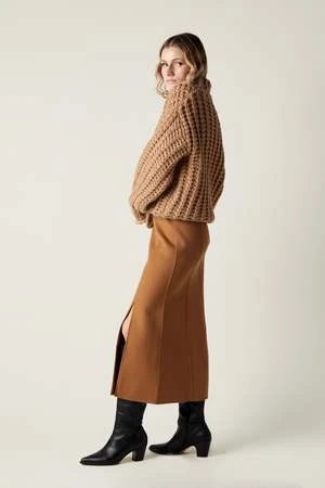 Made from unlined 100% wool, the Anine Bing Lyn Skirt is a midi length skirt in a beautiful camel colorway. It features a fluted silhouette, hugging the hips with a slight flare at the hem, and two half slits along the front.