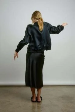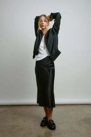 Simple bias skirt with below the knee length, simple clean elastic waist construction with no visible stitching. Cut from our heaviest silk, this cut is ultra flattering and a dream to wear. Raw edge at hem.