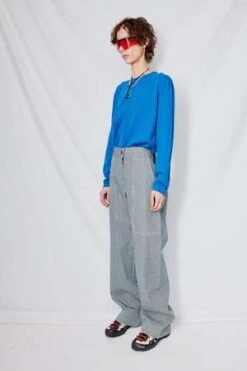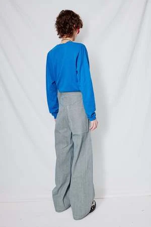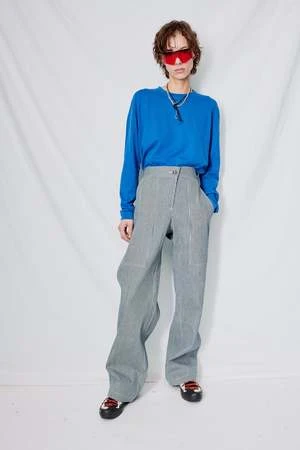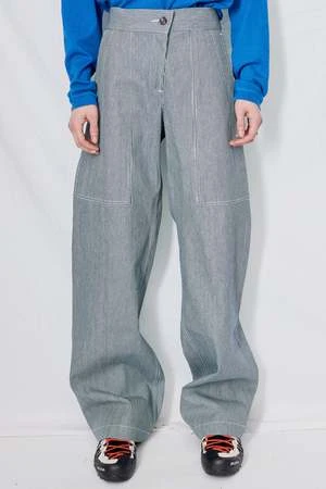 Railroad Stripe Denim Simple Pant from Assembly New York. Mid rise with a wide leg. Patch pockets. Lightweight wool.