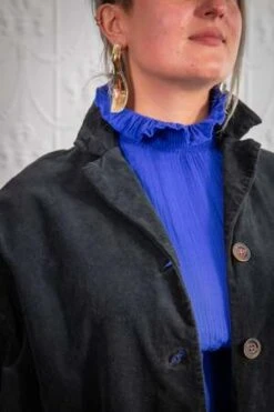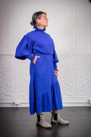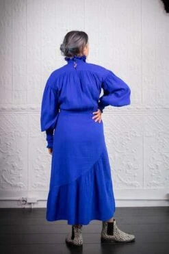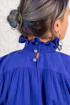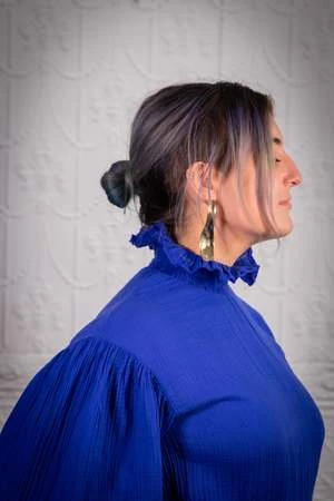 A nod to romantic days of past – high gathered collar, wide dramatic sleeves flow into a smocked lower sleeve , elastic waist for shaping, side seam pockets and an asymmetrical tiered skirt falls to above the ankle. Made from Atelier Delphines signature crinkle mid weight cotton gauze in the most magical blue. Pull on with smocking at the neckline and small buttons to close – this darling dress goes with you from season to season – clogs, boots and snuggly sweater to sandals and a straw hat for warmer days. 100% Japanese cotton, made in the USA – wash cool, tumble dry low or hang to dry. Dania is 5’4 and is wearing the size small, fits true to size. Shown with the Fay Andrada Kela earrings.