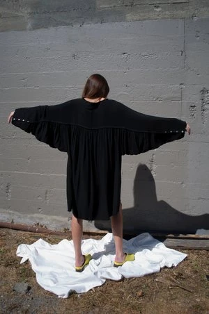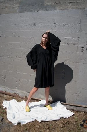 Atelier Delphine’s Serwa Dress is an easy, flowing dress featuring a gathered batwing sleeve and body construction, open neckline, raw hem, and button detailing along the interior cuff.