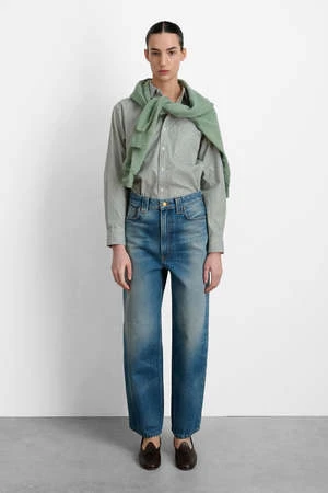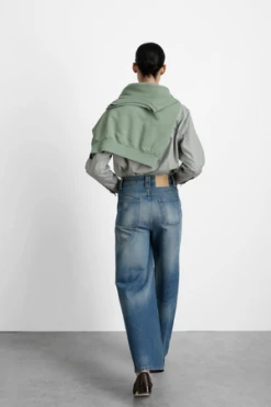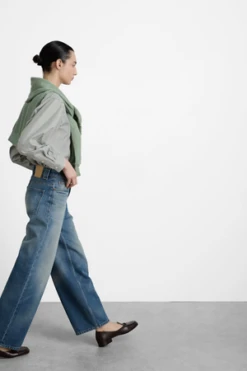 Mid waist long rise slouch fitting below the natural waist with a full length inseam.