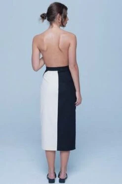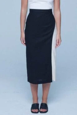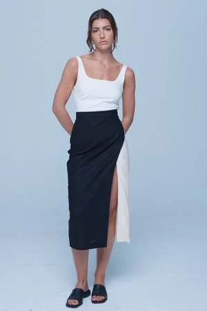 Fling out a leg in this bold two-tone side split skirt! Made from a beautiful linen / cotton fabric with a large fabric covered button at the back waist. Fully lined with a soft 100% cotton fabric.