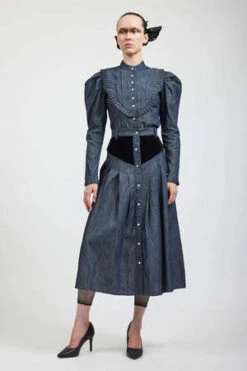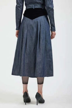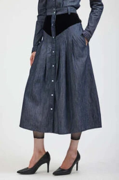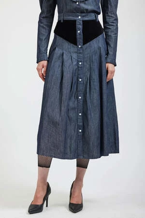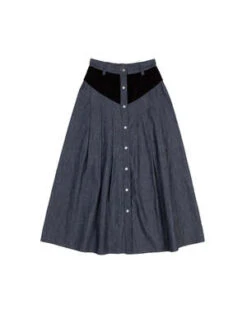 The Denim Patch Skirt in Grey Denim by Batsheva is a mid length skirt featuring patchwork detail, button front placket, and belt loops.