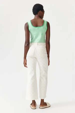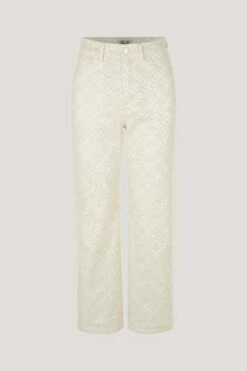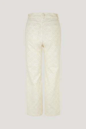 These mid-rise, flared trousers have a denim-feel with a Broderie Anglaise pattern throughout. They feature five pockets and a zip fly with button closure.