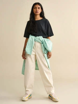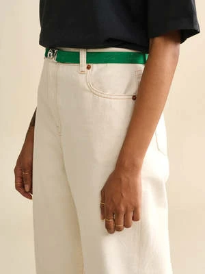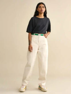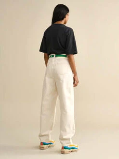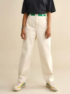 The Pimms Jeans from Bellerose have a relaxed, hip-hugging silhouette. Inspired by ’80s cuts and mom jeans, they feature curved, slightly cropped legs, a classic 5-pocket high-rise, and heavy organic cotton denim in an ecru tone with contrasting stitches.