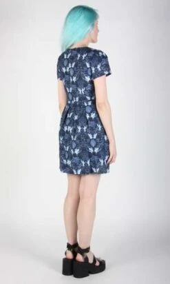 This dress has capped sleeves, pleats at the waist, front skirt pockets, and closes with an invisible zipper down the back. The body of the dress is 100% cotton, and the skirt is lined in a soft stretch satin that is 95% polyester, and 5% spandex. Shoulder to hem measures about 36″ in this style. This dress can be washed on a cold delicate cycle and hung to dry.