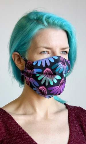 This print is such a beauty! It has an absolutely stunning mix of blue, green, purple and indigo hues of open Echinacea flowers on a charcoal background. It also comes in a mask!