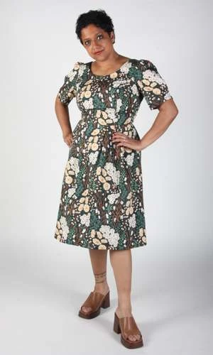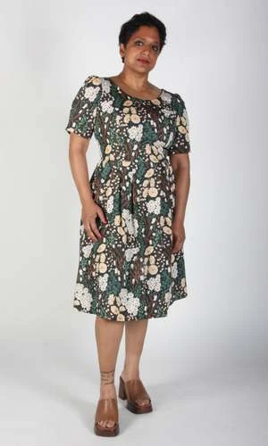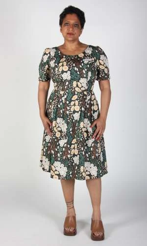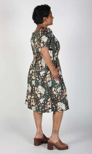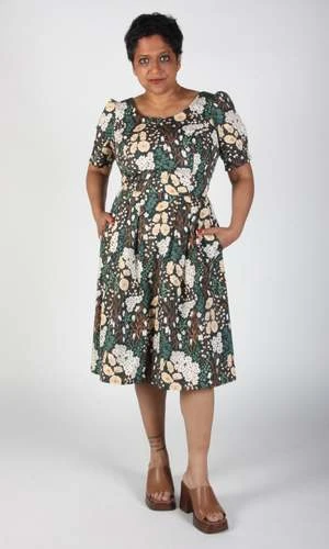 Winter Chippy was developed from one of our longest-running cuts, Gallinule, but has a slightly wider neck, a longer hemline, and a lovely elbow length sleeve! It has our classic fit and flare cut, with pleats at the waist, and front skirt pockets.