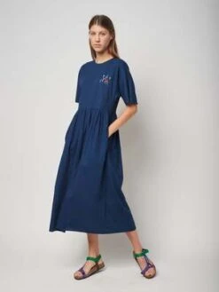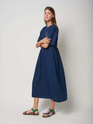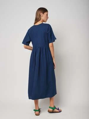 50% cotton 50% linen navy blue short sleeve dress. Designed with back zip fastening, side pocket, midi length and round neck. It has a loose fit. Made in Spain
