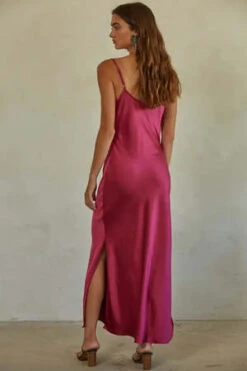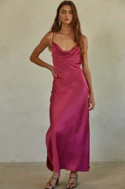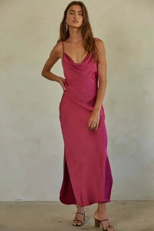 Your go to holiday dress! Woven satin cowl neck, spaghetti strap midi dress with side slits.
