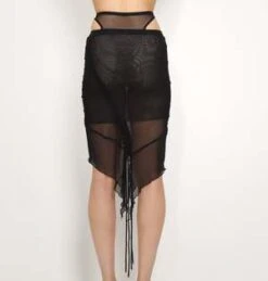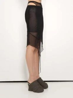 Black mesh skirt. Asymmetric hemline, sheer double layered mesh, shorter inner-skirt, long outer skirt, bias drawstring functionality to adjust the length.