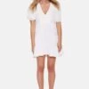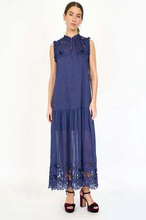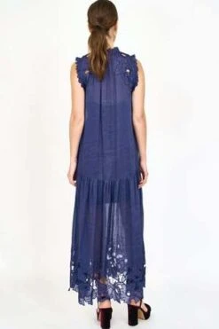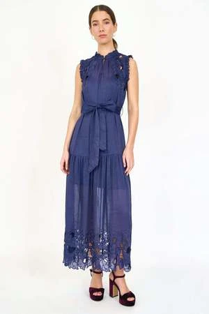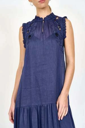 Christy Lynn Gemma Dress in Royal Blue. Staff favorite and the best-selling Gemma Dress in eye popping Royal Blue. Perfect for a wedding or an event, just add statement Valley Rose Jewelry. Lightweight, midi style, sleeveless dress that can be a turn around in which the key hole open in back can become open v-neck style. Features ruffle details at the neck and armholes and comes with a self-tie belt. Also, style down with tennis shoes or sandals. This dress is finished with a self-covered button at the center front neck, beautiful cutout details at the hem and ships with a matching stretch poly slip. 78% Linen, 22% Silk
