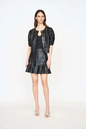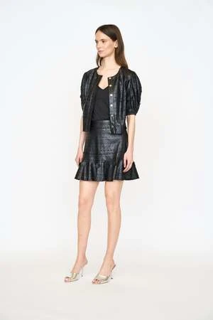 Introducing the Petra Skirt for Resort in our signature black vegan leather. The Petra is the same body as our classic Ashley Skirt but features a new embroidery and 3D flowers. This skirt falls around mid-thigh and is finished with elastic at the waistband and an invisible zipper at the left side seam.
