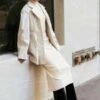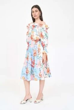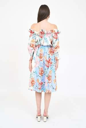 The Regina top in Ivory Garden print cotton voile has an elastic band at the shoulder to create an off-the-shoulder silhouette, smocked elastic detailing at the wrists and pleated details down the center of the top.