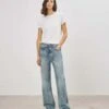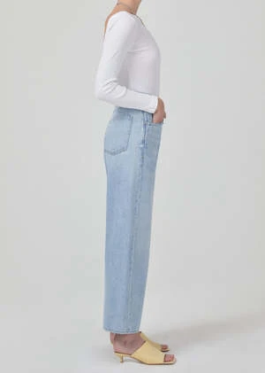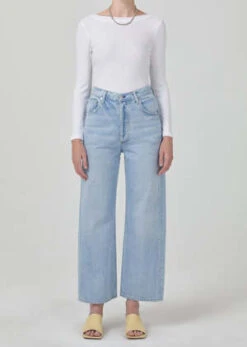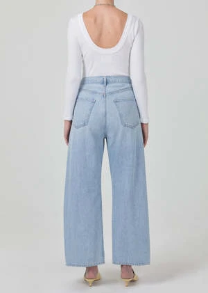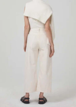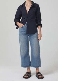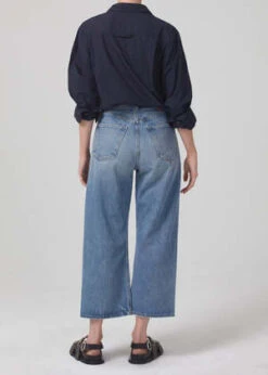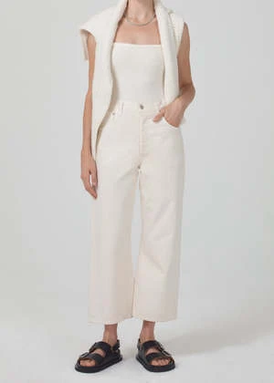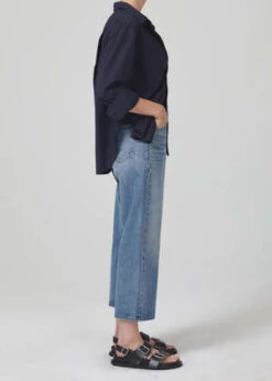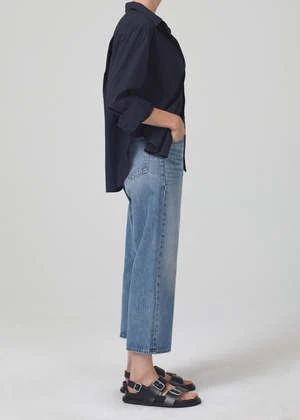 The Gaucho is a vintage inspired silhouette that sits high at the waist with an easy, relaxed top block. Cut with an ultra-cropped inseam and voluminous wide leg shape. Wear yours with a slim-fitting tee or tank to balance the shape. Medium classic indigo with slight fading and a finished hem, midweight non-stretch denim.