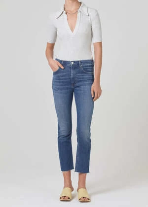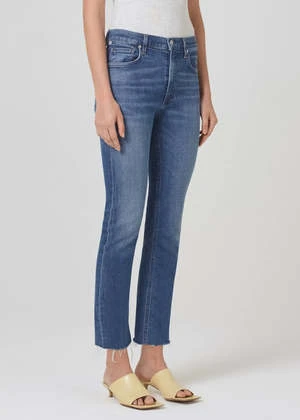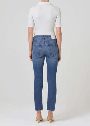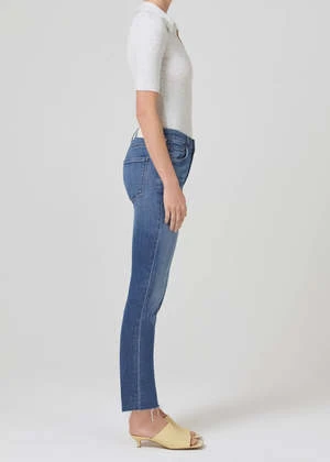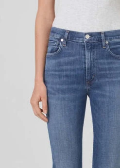 A mid-rise and an ultra-flattering top block. Designed with a slim fit to the knee and a 26″ inseam. Medium vintage indigo with strong fading and whiskering, raw hems.