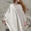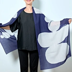 Our Ebb + Flow Cairn wool scarf is a sheer, 100% wool woven fabric that is screen printed with an abstract navy and light blue design based on Claudias series of cairn paintings. It measures 72 x 26 and is dry clean only.