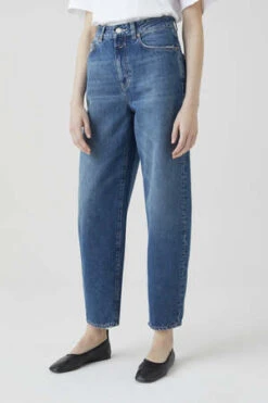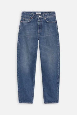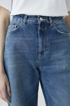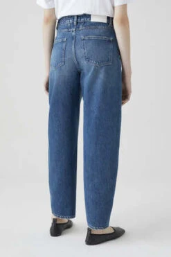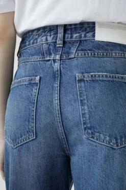 Relaxed fit made of innovative Italian rigid denim by Candiani with post-consumer cotton 24% of the cotton used for the production of these jeans comes from worn jeans. 5-pocket jeans with a high waist and wide leg. 100% made in Italy. Part of our sustainable denim line A BETTER BLUE.