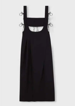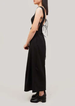 Black maxi-length sleeveless dress with an elegant cut-out neckline. Features side pockets and adjustable sides and back with laces.