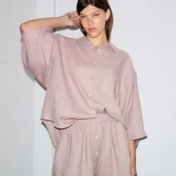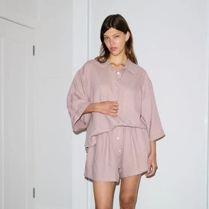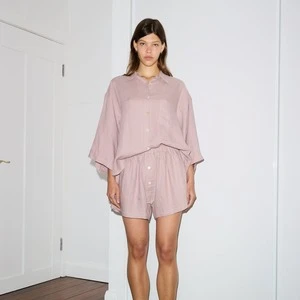 The 03 lounge set features an oversized box fit linen shirt with wide arms and a front pocket. Designed to sit mid rise, the loose fitting boxer style shorts have a faux button down fly and an elastic waist for extra comfort. Style as a set or separately, at home or as day wear.