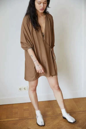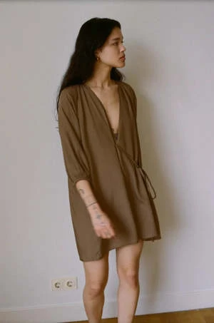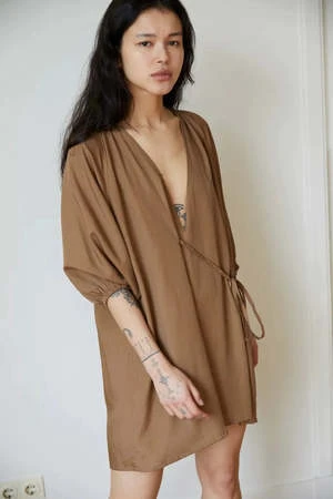 The Double Over Dress by Deiji Studios is an elevated day dress in a perfect short length featuring a gathered neckline with v front. Designed to wrap over to a self fabric with asymmetric tie for an adjustable shape with a soft elasticated raglan sleeve.