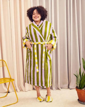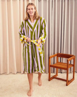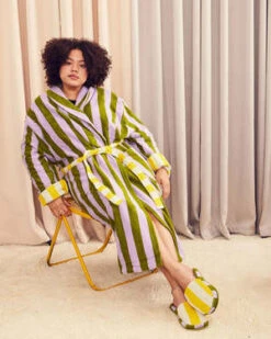 She stripes sea stripes in her bathrobe.