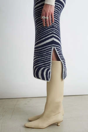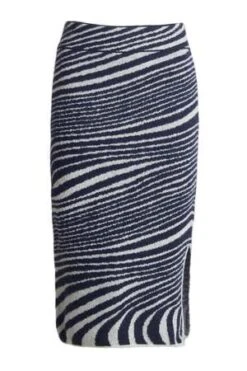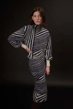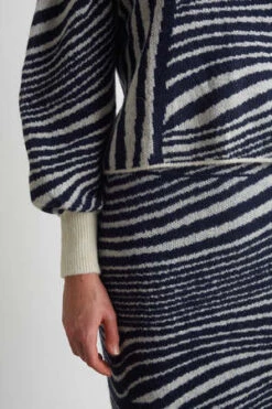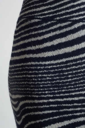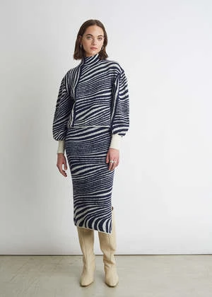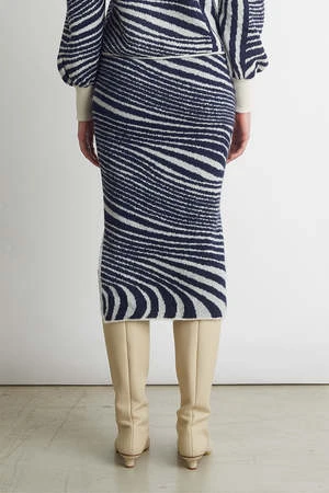 A patterned sweater-skirt inspired by artwork from artist: Ben Stubbington translated using a double-bed-jacquard stitch. This slim, easy pull-on tube skirt with kick-split is made from the softest, air-spun alpaca yarn.