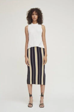 Jamie is a versatile, sweater tube-skirt to pull on and go as an easy wardrobe stable. The vertical striped-pattern is inspired by heritage Moroccan, berber textiles from the Co-founder: Catherine Carnevale’s honeymoon-travels as well as one of her favourite pieces from the Spring 20 collection. Jamie has a double elasticated waistband that can be positioned on the body to be flattering to the wearer. Made in Peru with 100% Peruvian cotton.