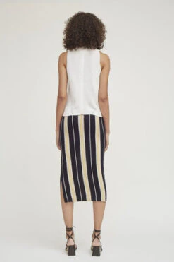 Jamie is a versatile, sweater tube-skirt to pull on and go as an easy wardrobe stable. The vertical striped-pattern is inspired by heritage Moroccan, berber textiles from the Co-founder: Catherine Carnevale’s honeymoon-travels as well as one of her favourite pieces from the Spring 20 collection. Jamie has a double elasticated waistband that can be positioned on the body to be flattering to the wearer. Made in Peru with 100% Peruvian cotton.