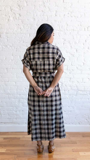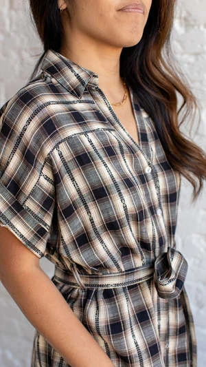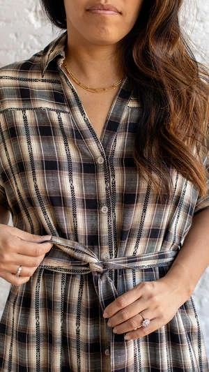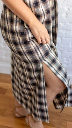 Got a fall photoshoot lined up but dont know what to wear? Look no further than the Annabel Plaid dress! This beautiful button up style dress comes in a timeless neutral palette with some small gold stitching for detail! It is full length with slits on the legs and a tie around the waist to give some shape.