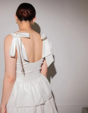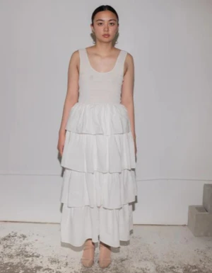 Maxi dress with tiered skirt and adjustable tie straps. Shirred bodice allows for lots of stretch