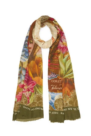 The Florilegi stole in modal and cashmere blend is in collaboration with Coreterno, a lifestyle brand inspired by a wonderfully mysterious world. The print is mystical and authentic, making every look playful and never banal.
