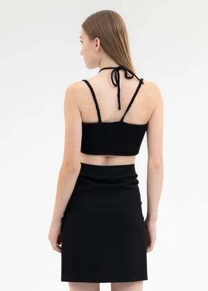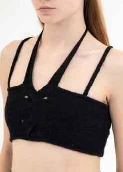 Cable knit bralette in black, from Feng Chen Wang. Knitted paneling and shoulder straps. Tied fastening at the nape. Tonal stitching throughout.
