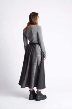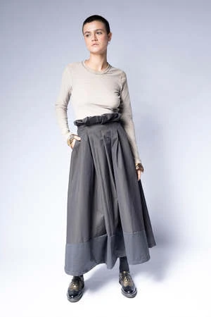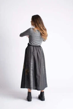 Introducing Francesca Marchisio’s H20 skirt: a stylish and versatile maxi skirt designed to make a statement. Crafted from luxurious black and grey fabric, it features a wide A-line silhouette, draped at the waist with hand sewn ironed pleats. Finished with a button closure and elastic loop for an adjustable fit, the skirt is fully reversible and perfect for any occasion. Wear the H20 skirt and make an impression!