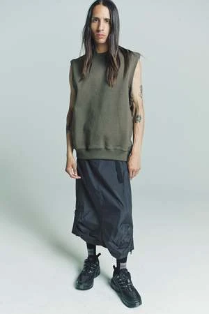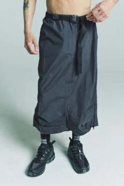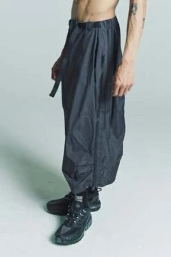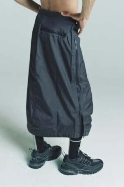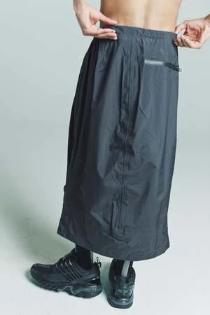 The shape comes from our carry over sty-le arc pants, which has been repurposed as a skirt; it features the classic arc pan-ts details, such as long zip on the legs, elastic belt and pinces on knee. The style is unisex. Main fabric is water repellent ripstop 3l. Features include; two way wr taped zipper along the full leg, elastic belt with buckle, deformed knee, coated zip pocket on the back, snap button front closure, heat taping inside.