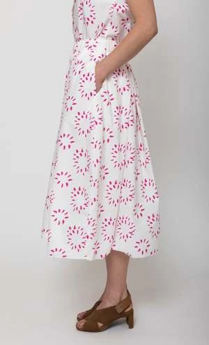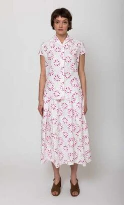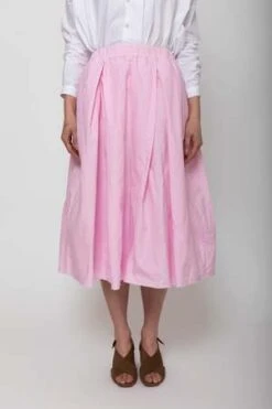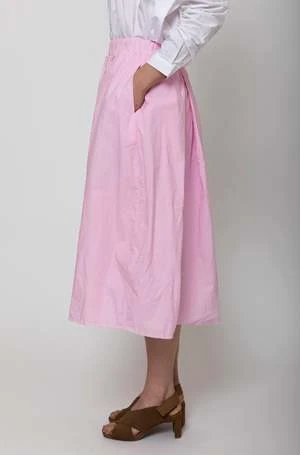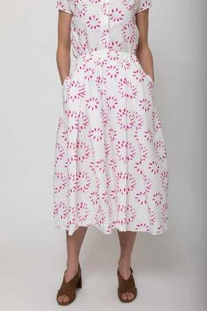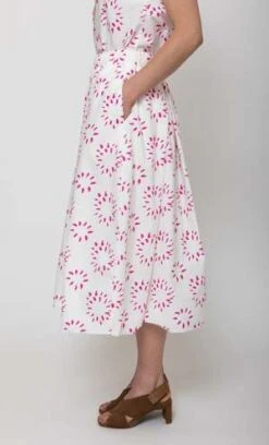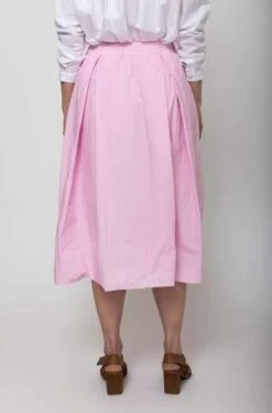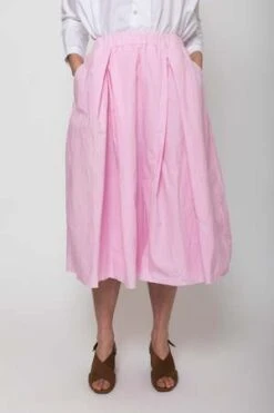 The Jenna Skirt by Hannoh Wessel in pink or shocking flower features an elasticized waist with tie detail, side pockets, and box pleats. Model is 5’8″ and is wearing a size 34.