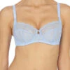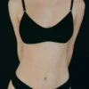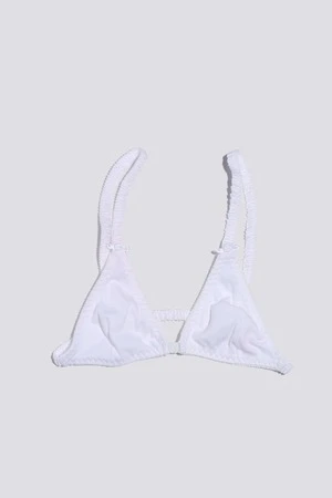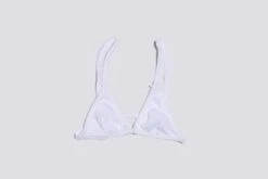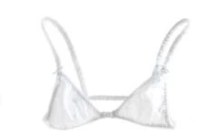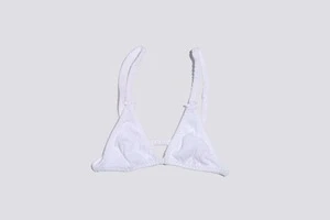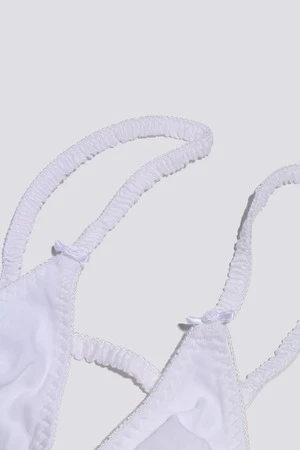 Soft cup triangle bra. Front hook closure. The Hello Beautiful white cotton romance bra is made with 100% combed baby rib-knit cotton made in California. Bra cups are set with old- fashioned zig- zag stitching and plush picot-edge elastic. Two white satin rosette appliqus are centered on the front of the bra for a little romance.