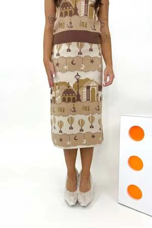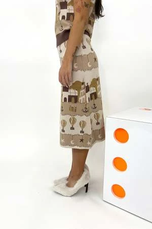 Hot air balloons, story books, stars and moons: who wouldn’t want this print on their body?? The Ami Skirt by Helmstedt is an A-line jacquard knitted skirt with a detailed night time print fit with an elastic waistband. A beautiful knit set that is extremely comfortable and great to style up or down. Meg wears the Ami Skirt by Helmstedt with the matching Ami Vest and Giorgia Heel by Iceberg.