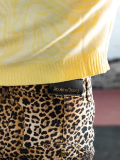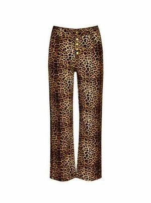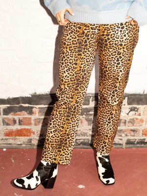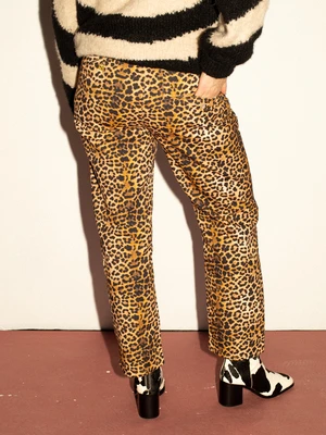 Leopard print, cropped jeans with gold button fly.