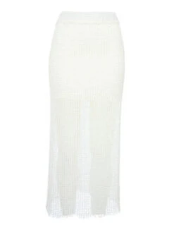 This Denise Skirt is a semi sheer midi length by IRO Jeans and is made from a slubby mesh knit fabric. The covered waistband and mid thigh jersey underlay make it the perfect transeasonal item. Wear it to the beach or with boots.