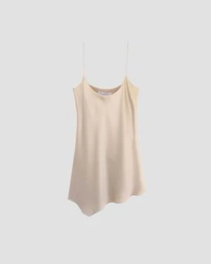 Bias cut camisole with a soft drape, asymmetrical hem, spaghetti straps, and silk lining.