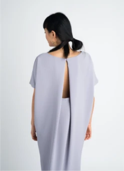 BEST SELLER! the kaarem triangle open back dress is a trademark midi-length style constructed with two pieces of fabric and a natural drape creating the open back detail. the dress features a hand braided button loop is finished with a blind stitch.